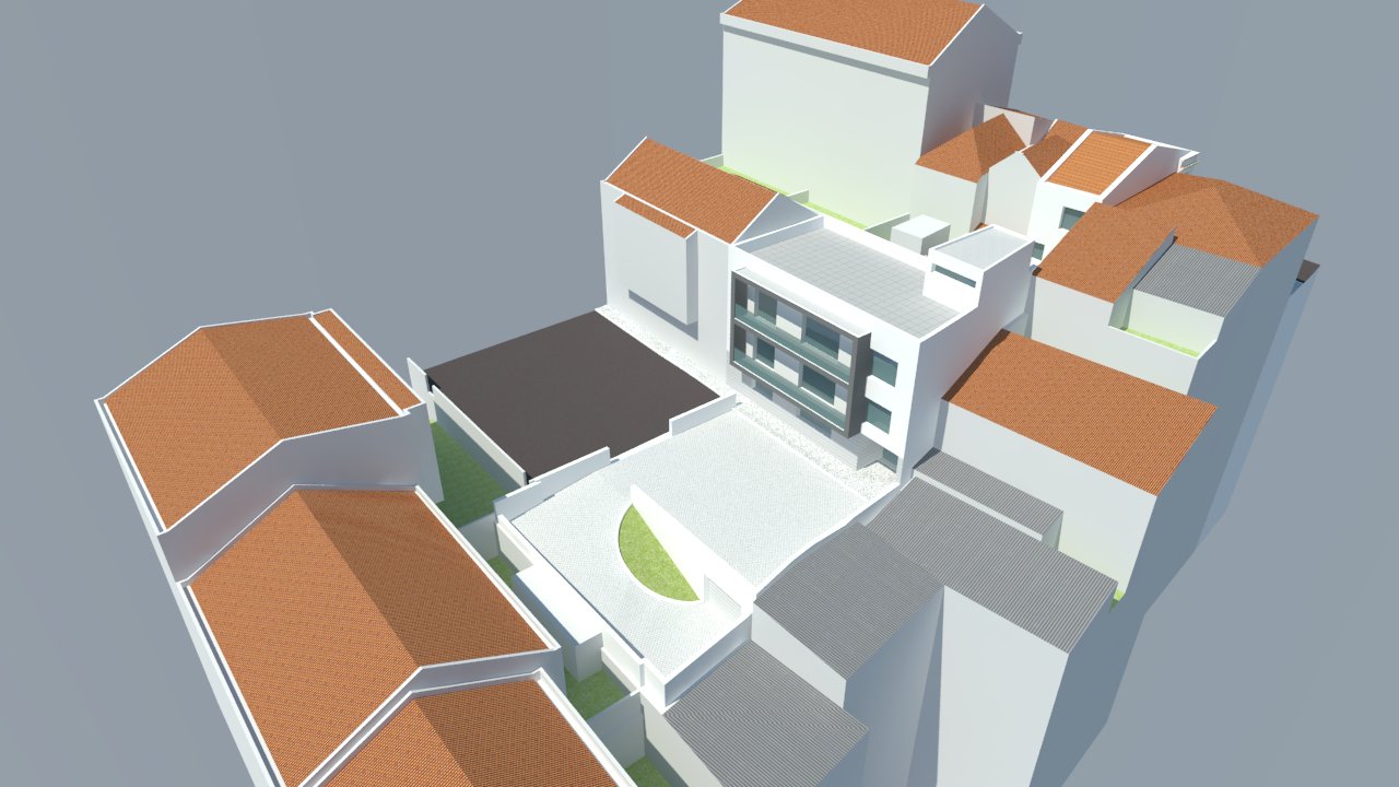 Este edifício moderno será composto por cinco apartamentos de tipologias T2 e T3, projetados com foco na funcionalidade e no conforto. A fachada terá acabamentos contemporâneos e incluirá o sistema ETICS, proporcionando isolamento térmico eficiente e maior eficiência energética. O volume edificado destaca-se por linhas geométricas sóbrias e varandas integradas no corpo da construção. A implantação adapta-se à topografia do terreno, incluindo cave com estacionamento.