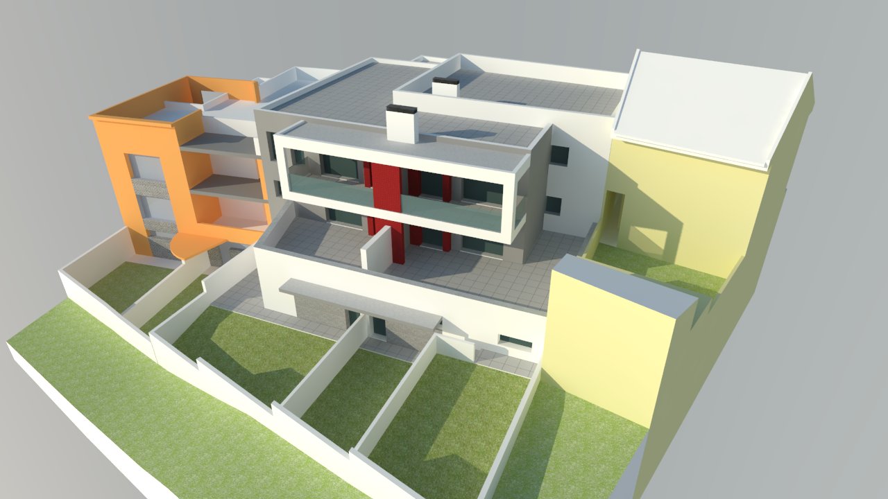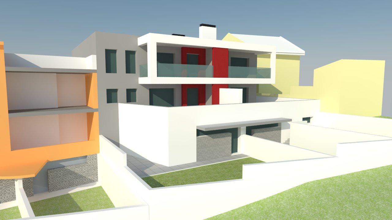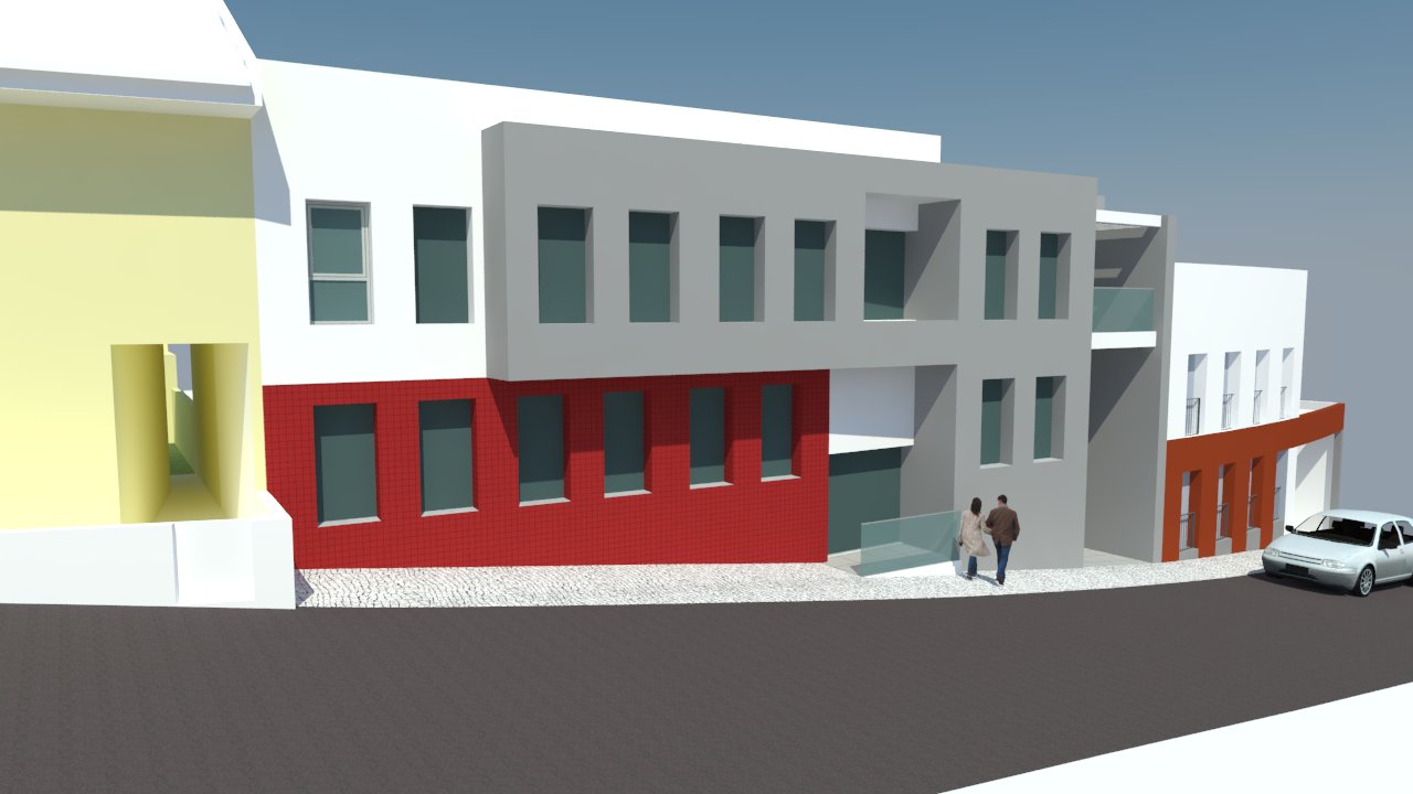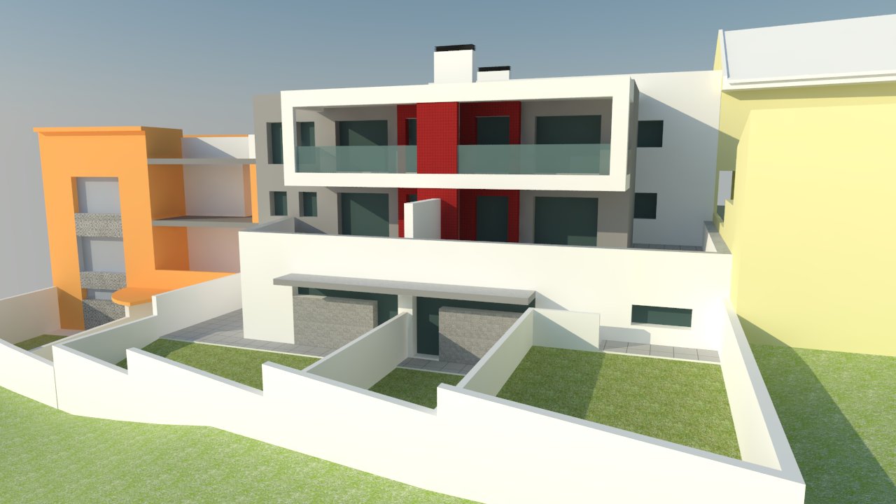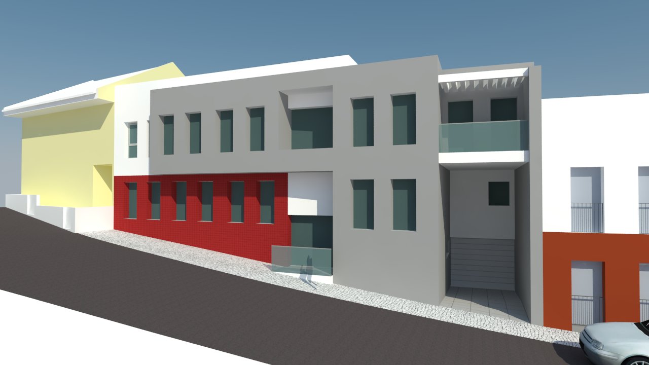 O edifício apresenta um design moderno com acabamentos contemporâneos e fachada com sistema ETICS (isolamento térmico pelo exterior), garantindo eficiência energética e conforto térmico. A construção é composta por dois pisos principais, distribuindo-se em quatro apartamentos de tipologias T2 e T3. A fachada combina revestimento liso com áreas destacadas em vermelho texturado, conferindo-lhe identidade arquitetónica. A implantação adapta-se ao declive do terreno, com acessos diferenciados e varandas que valorizam a luz natural. Trata-se de um projeto habitacional urbano pensado para famílias, aliando funcionalidade, estética e sustentabilidade.