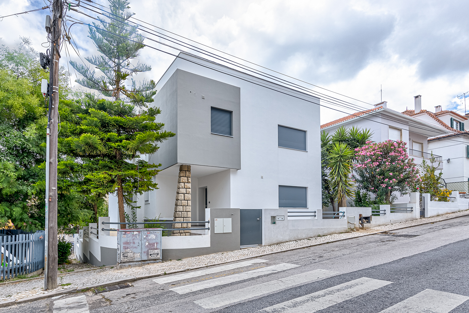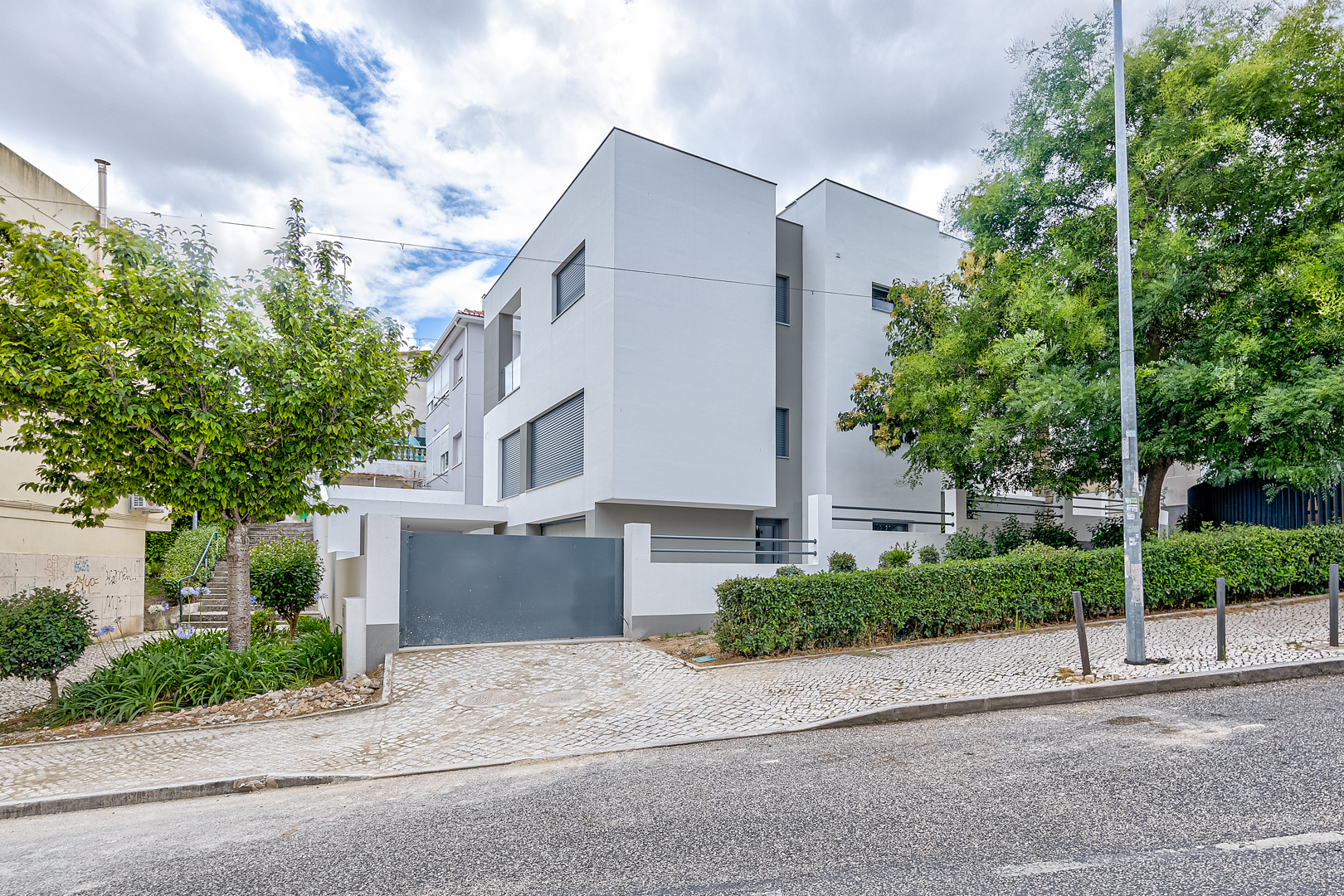 Rua Padre António Vieira, em Santa Iria de Azóia, destacando-se pelo seu design contemporâneo, linhas retas e integração cuidada com o espaço urbano envolvente.